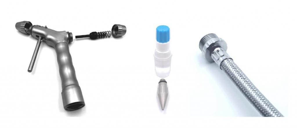 Edelstahl-Reinigungspistole mit Edelstahlhandgriff 1/2"-Innengewinde und Verschraubung, Spitzdüse und Silikonöl.